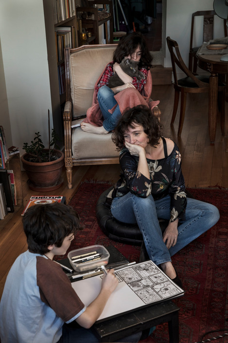 This shot shows the same family but also shows the daughter and cat. Although they are present in the shot, we mainly focus on the mother and son. This shot is a lot more positive than the previous. The mother looks at the son with contentment as he colours in pictures. Altough the family are still in quarantine, this shot shows them in a more positive manner. The shot has been lit by day light through a window. It seems there are atleast two windows, one from the direction of the camera and one to the far right. This image has the same soft tones and lighting as the other image, which works well as part of the series and brings a common theme, alongside the subjects. The image is shot in portrait with an iso of about 200, a shutter speed of aroud 1/80 and an aperature around f/8. I like the image as a whole and the way it shows the family being together and making the most out of lockdown.