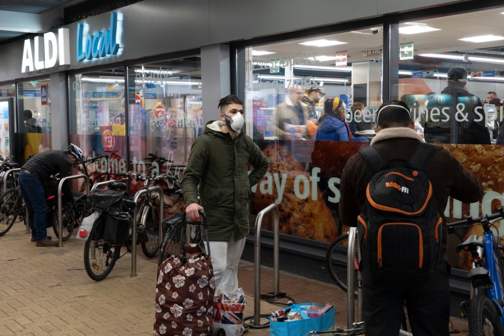 This image shows people out in public at the beginning of the pandemic in the UK. You can tell people aren’t social distancing as seriosuly at the stage it was taken, apart from the main subject who is wearing a face mask and gloves. He stands out as everyone else is in pairs and not wearing any form of protection. The image has a wide aperature, with the wholw shot being in focus, suggesting it was around f18. The strong shadows suggest it was mid day and the shot seems to be purely be lit byu sunlight.