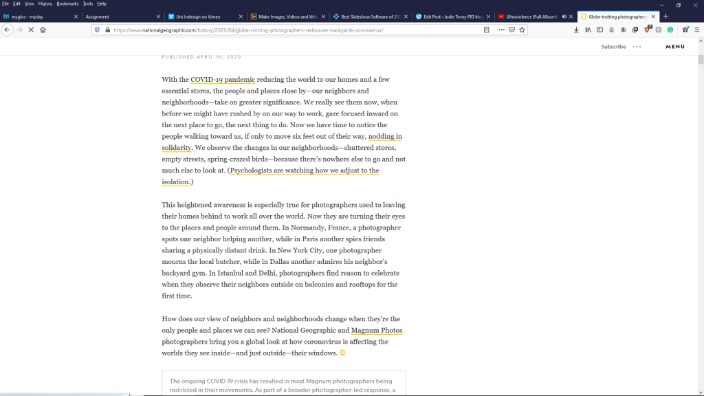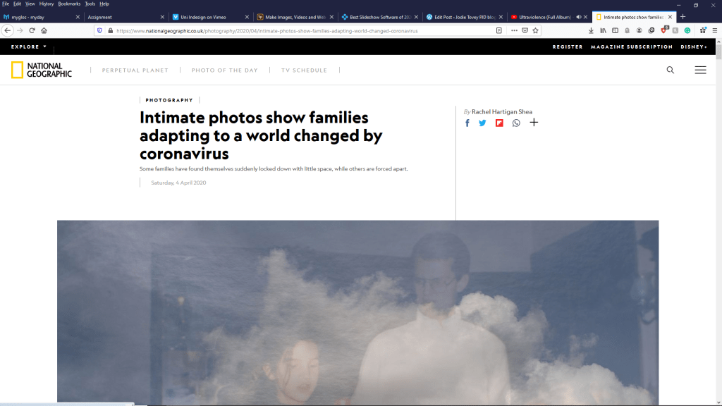 National geographic tend to keep their articles factual, which is what I also plan to do with my magazine spread. They also use text that is relevant to the images next to the text. I have have an opening text that gives context and then accompany factual statistics next to the images. For example, for an image that shows a key worker, I will have a simple text talking about how that has changed in response to the pandemic.
