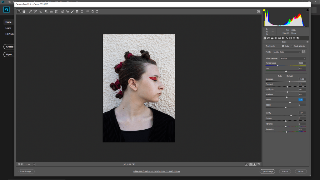 I used camera raw filter to make some adjustments to brighten the image. I increased the exposure, white and shadow which helped to lift the image. I also increased the clarity to make it more sharp.